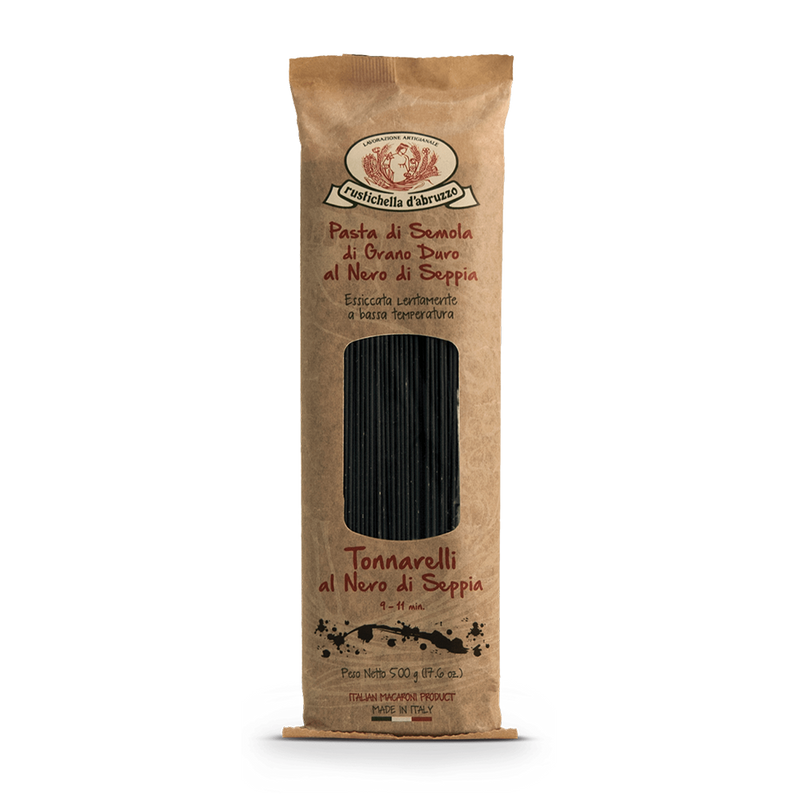 O Tonnarelli tem formato comprido e quadrado com o dobro da espessura do Spaghetti. O Tonnarelli Al Nero di Seppia Rustichella é produzido artesanalmente, com grano duro de altíssima qualidade e 100% Italiano. Produzida em moldes de bronze, a massa se torna mais áspera, absorvendo melhor os molhos. Possui secagem mais lenta em temperaturas mais baixas, preservando o sabor e aroma do trigo. Produzido com tinta de lula natural, harmoniza perfeitamente com frutos do mar.